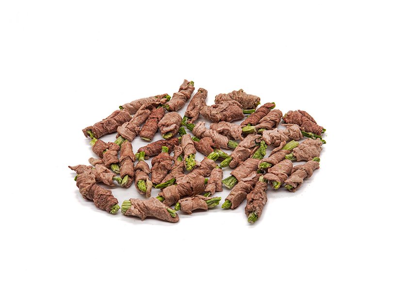 FB04A Beef Wrap Asparagus combines the savory taste of beef with the crisp flavor of asparagus. This freeze-dried treat is high in protein and vitamins, promoting healthy digestion, skin, and coat.